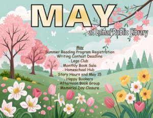 May • Summer Reading Program Registration • Writing Contest Deadline • Lego Club • Monthly Book Sale • Homeschool Hub • Story Hours end May 15 • Happy Bookers • Afternoon Book Group • Memorial Day Closure